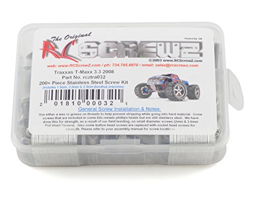 Studio : RC Screwz Publisher : RC Screwz Binding : Toy Product Description This is a optional RCScrewz Stainless Steel 200 plus piece screw kit for the Traxxas T-Maxx 3.3 2008.? RCScrewz Stainless Screw Kits are 100% complete.? Your new kit will include everything needed to do a full conversion and more.? Stainless Steel Screw Kits are far superior to the screws that come stock with your RC.? RCScrewz kits are made with the best stainless steel money can buy.? No more bent, rusted, or corroded screws. Never worry about stripped heads again.? You will not find a better screw kit for your RC at any price and RCScrewz Guarantee's it.? If for any reason your not 100% satisfied with your kit, return your screw kit to RCScrewz and they will send you a full refund for the price of the kit. All RCScrewz Kits include: All socket screws Extras Button Screws Extras Flat Head Screws Extras Set Screws Extras Nuts Extras Washers Extras Bondhus Short Arm hex Wrenches All Sizes Qua... 0