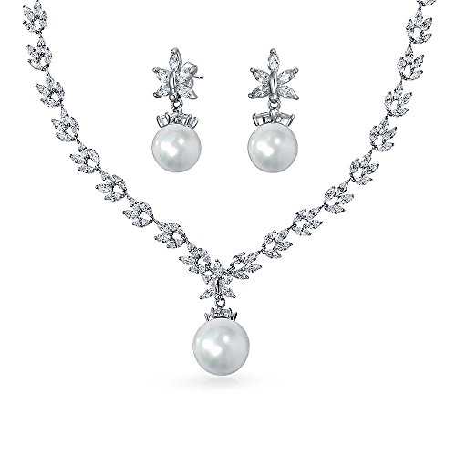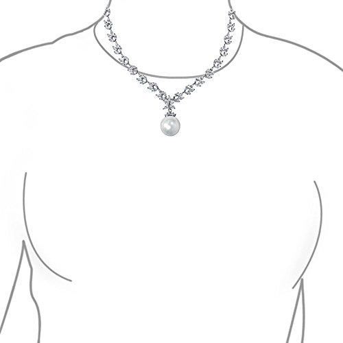 -. Feature : Bridal Necklace and Earrings Cubic Zirconia Set / White Simulated Pearl, Rhodium Plated Brass / 18.5 in necklace 15 mm width / Measure: 18.5in in necklace length x pearl width is 6mm x 1in in earring length