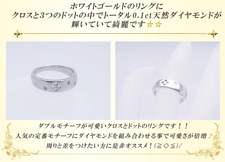 商品説明 クロスと3つのドットの中で0.1ct天然ダイヤモンドが輝くかわいいホワイトゴールドリングです。