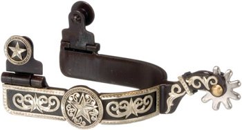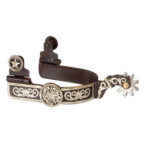 Product Description Antique brown spur with engraved silver overlay on band and shank star design on button and band. Band width 3/4". Star 1". Shank 2". 9 pt rowel. 0