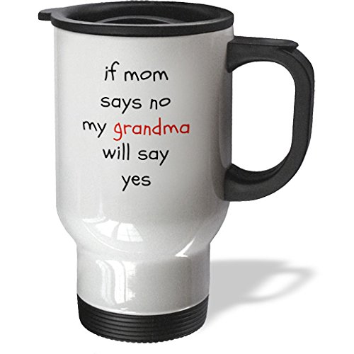 3dRose tm_192427_1 If Mom Says No, Grandma Says Yes, Black Letters on White Background Stainless Steel Travel Mug, 14 oz, White