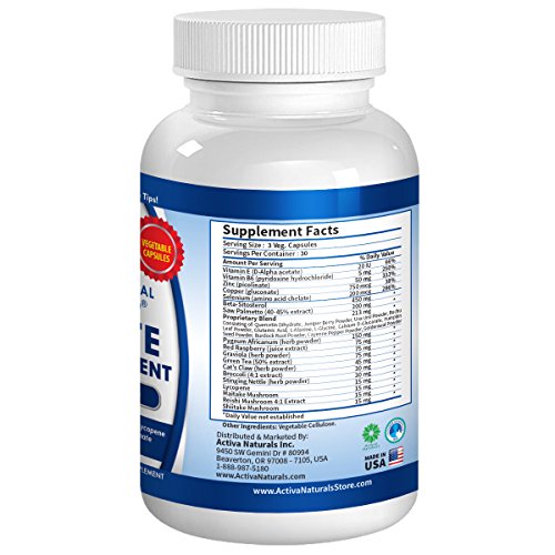 -. Feature : WHY PROSTATE HEALTH SUPPLEMENT - Prostate Health Supplement may help support prostate and urinary system health by providing nutritional support with Natural & Herbal Saw Palmetto, Pumpkin Seeds, Pygeum Africanum, Green Tea, Raspberry, Maitake, Reishi & Shiitake Mushrooms, Juniper Berry, Uva Ursi, Buchu Leaf, Burdock Root, Cayenne Pepper, Goldenseal Roots and other Herbs* / LOVED BY CUSTOMERS - Improve Quality of Life by Adding healthy foods, daily exercises and the daily required water intake along with herbal nutrients to support active lifestyle routine, urinary system health and overall wellness* / MORE VALUE FOR LESS - 90 Vegetarian Capsules, Manufactured in USA, No Fillers, No Chemicals, No Additives, No Artificial Colors and Strict Quality Systems to Give you the best Prostate Health Vitamins Formula to help support prostate health Naturally* / A TRUSTED BRAND - Activa Naturals is Known for their Natural and Herbal Specialty Vitamins providing you the highest quality ingredients - Our Focus is Giving you the best Prostate Health Capsules rather than Making Any Claims about our products - Unique Herbs (Saw Palmetto, Pumpkin Seeds, Maitake, Reishi & Shiitake Mushrooms, Juniper Berry and many more) added to support Active Lifestyle* / BUY CONFIDENTLY FROM US - We will work with you until you are fully satisfied as Activa Naturals Products are always covered by a 60-Day Hassle Free Warranty