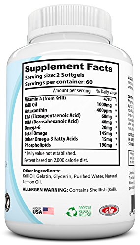 -. Binding : Health and Beauty -. Brand : Pure -. EAN : 0647356950841 -. Feature : 100% PURE HIGH QUALITY PURE-K ANTARCTIC KRILL OIL 1000mg Per Serving: Our Top Rated #1 Krill Oil is 100% Purified, Mercury FREE, Gluten FREE, Solvent FREE and GMO FREE. Sourced from Euphausia Superba. / MEGA DOSE 2X MORE EFFECTIVE THAN REGULAR FISH OIL: 1000mg Mega Rich Dose of Krill Oil w/ Astaxanthin which acts as Free Radical Scavenger and a source of Omega 3, 6 and 9. BEST VALUE! 120 Softgels 60 DAY SUPPLY! / SUPPORTS HEALTHY IMMUNE SYSTEM AND JOINT HEALTH: PLUS Aids in Eye Health & Skin Health. / NO FISHY AFTER TASTE: No More Fish Burps like you may get from other Fish Oil or other Omega 3 supplements. / 100% MONEY BACK GUARANTEE: You have nothing to lose, backed by our 100% Money Back Guarantee! If you are not 100% satisfied with your results, return for a full refund. -. IsAdultProduct : 0 -. Label : Pure Label Nutrition -. LegalDisclaimer : *These statements have not been evaluated by the Food and Drug Administration. This product is not intended to diagnose, treat, cure, or prevent any disease. Pure Label Nutrition is not liable for the authenticity of any of the information above. With the rapid rate of scientific studies these days, new information is validated and debunked daily. To maximize results, work hard in the gym daily and eat high quality nutrition. Actual product packaging and materials may contain more and different information than what is shown on our website. We recommend that you do not rely solely on the information presented and that you always read labels, warnings, and directions before using or consuming a product. Please see our full disclaimer below. -. Manufacturer : Pure Label Nutrition -. MPN : 647356950841 -. PackageQuantity : 1 -. PartNumber : 647356950841 -. ProductGroup : Health and Beauty -. ProductTypeName : HEALTH_PERSONAL_CARE -. Publisher : Pure Label Nutrition -. Size : 120 Capsules -. Studio : Pure Label Nutrition -. Title : Krill Oil 1000mg w/ Astaxanthin (120 caps) PURE-K Top Rated #1 Fish Oil Omega 3 6 9 - EPA DHA - 100% Purified & Mercury free - Mega Dose Phospholipids - Non GMO - Gluten FREE - Pure Label Krill Oil -. UPC : 647356950841
