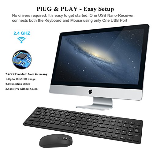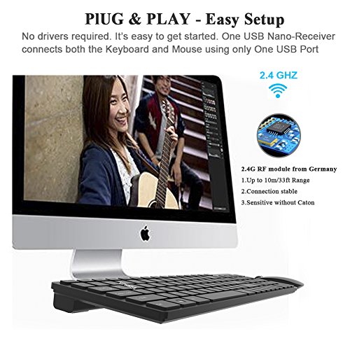 【PlUG & PLAY - Easy Setup】No drivers required. Reliable 2.4 GHz wireless connection. offering a reliable connection and virtually no interference up to 33ft/10M range. It's easy to get started. One USB Nano-Receiver connects both the full size wireless Keyboard and wireless Mouse using only One USB Port.