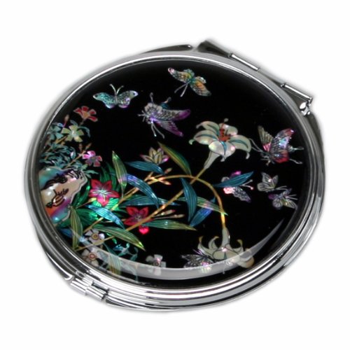 Mother of Pearl Lily Flower Design Black Compact Cosmetic Double Makeup Pocket Round Mirror, 3.2 Ounce