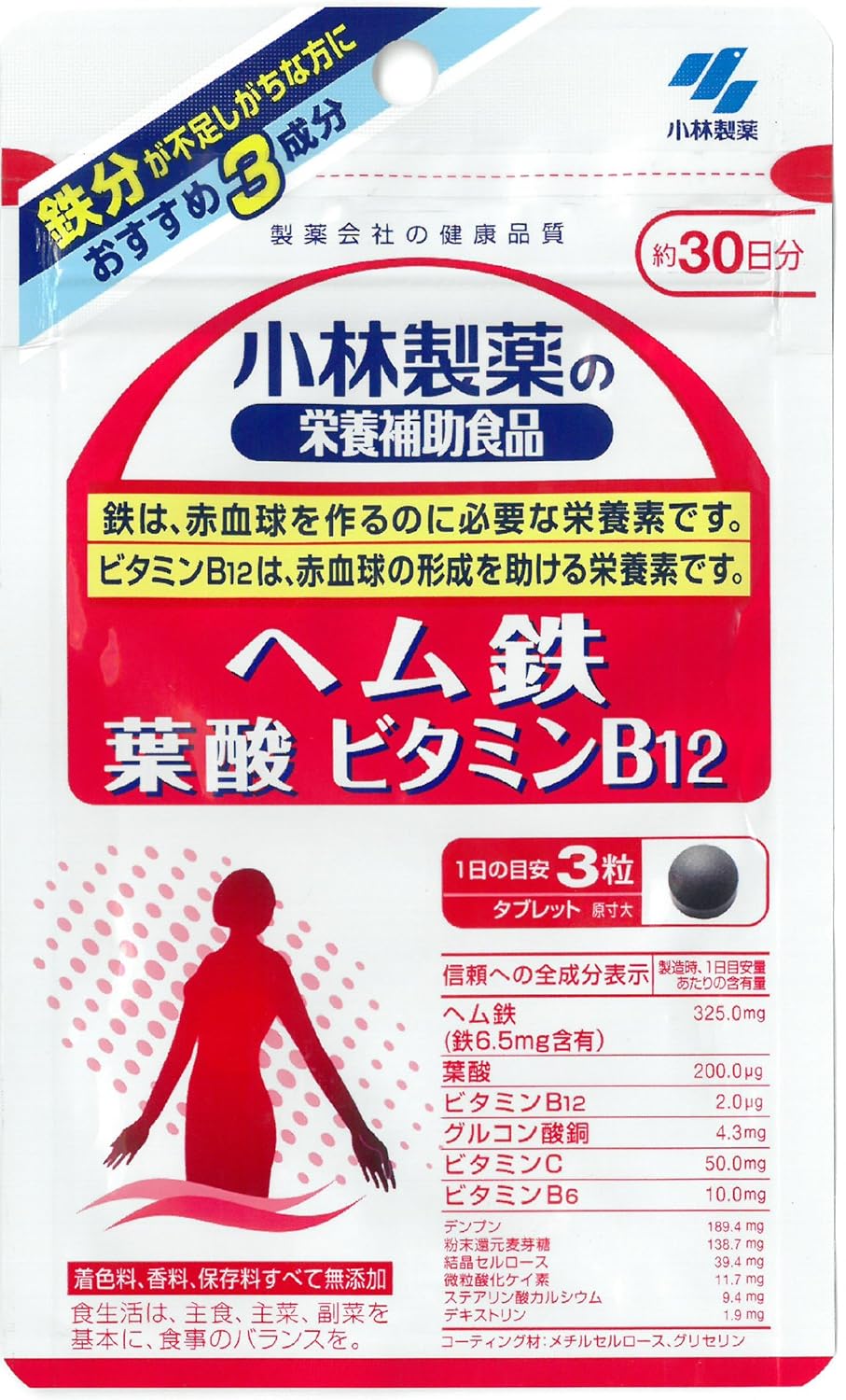 原産国 : 日本 原材料 : デンプン、粉末還元麦芽糖、デキストリン、ヘム鉄、ビタミンC、結晶セルロース、ビタミンB6、微粒酸化ケイ素、ステアリン酸カルシウム、メチルセルロース、グリコン酸銅、グリセリン、葉酸、ビタミンB12 内容量 : 90粒 商品サイズ (幅X奥行X高さ) : 100×11×165