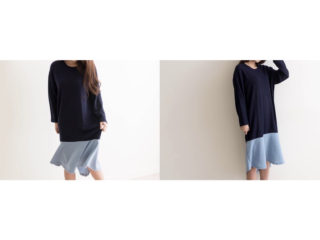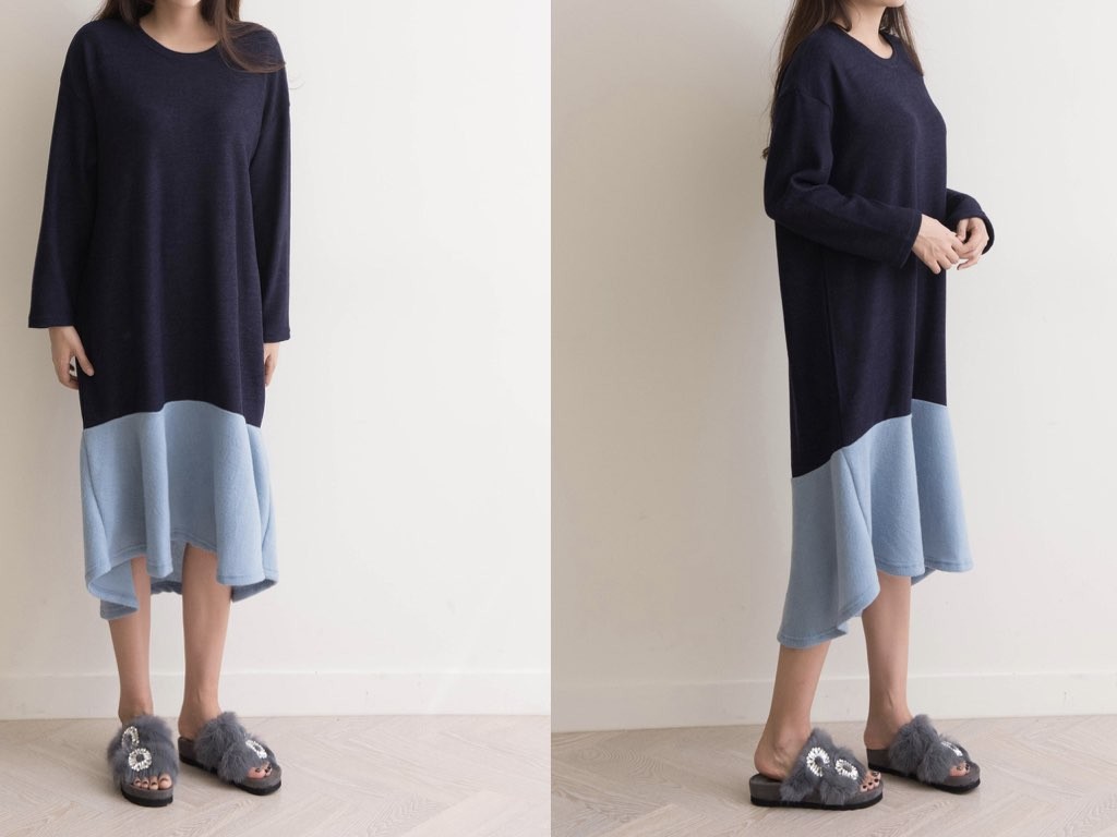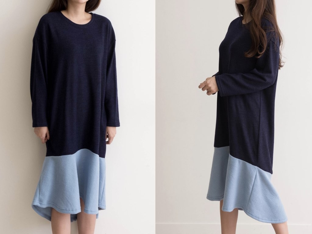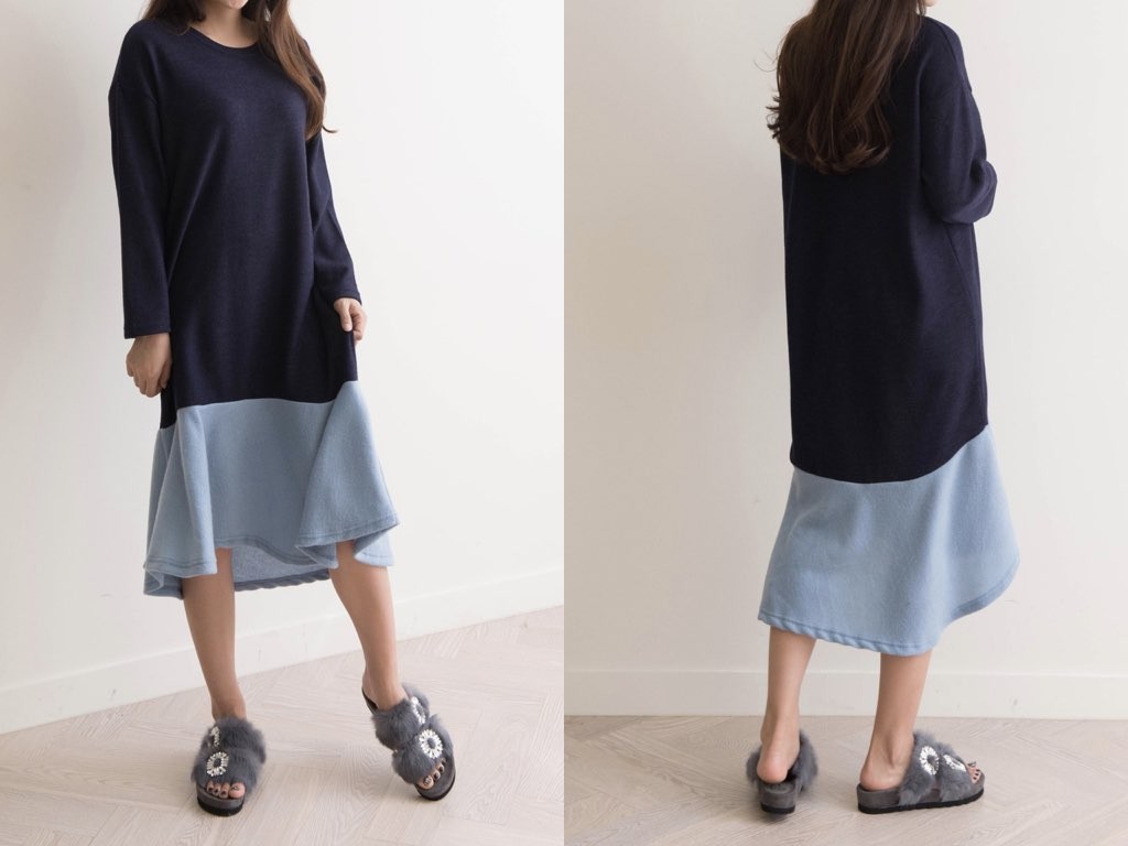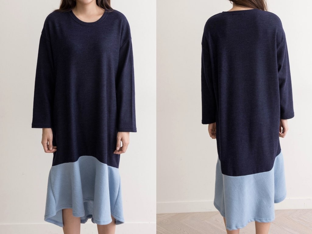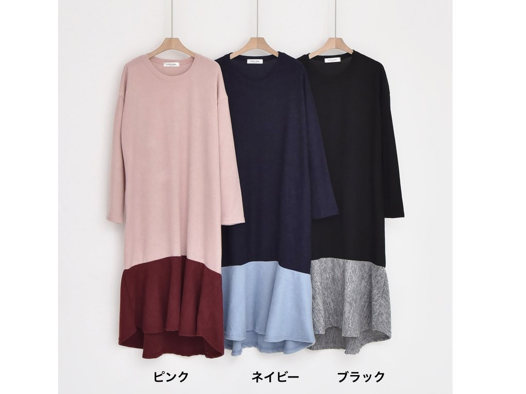 2色の切替し「ふわっふわ」としたワンピースです。とても丁寧なつくりとなっており、ゆったりと着ることができます。1.基本情報色:ブラック・ネイビー・ピンクサイズ:Free素材:ポリエステル/スパン製造国:Korea2.サイズ情報肩幅:52cm 身幅(胸断面):56cm 腕の長さ:45cm 着丈(前):104cm着丈(後):105cm(サイズは計る方法に応じて±2〜3cmの誤差があります。ご了承お願い致します)モデル着用サイズ:F※着用モデル(163cm、体重47kg、足のサイズ245mm)3.その他の情報厚み:中間透け感:なし伸縮性:高裏地:なし洗濯方法:ドライ(クリーニング)お取り寄せ商品は、納品まで約10日前後いただきます。ご了承お願い致します。