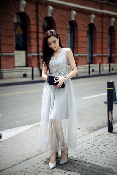刺繍レース シースルー ノースリーブ シフォンワンピース ロングドレス