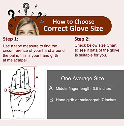 How to choose your size-- To obtain your glove size, use a tape measure to find the circumference of your hand around the palm. This is your hand girth at melacarpal. For example,if hand measurement is 6.5", we suggest you choose a glove with hand girth which is 0.5" bigger or smaller than your hand for a best fit.