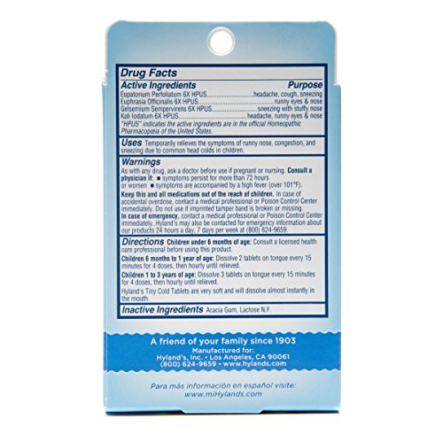 Hyland's Baby Nighttime Tiny Cold Tablets, Natural Relief of Runny Nose, Congestion, and Occasional Sleeplessness Due to Colds, 125 Quick-Dissolving Tablets Temporarily relieves the symptoms of severe cold and flu including the early onset of flu, runny nose and nasal congestion, sore, hoarse throat, cough, headache and body ache, fatigue, fever and chills.