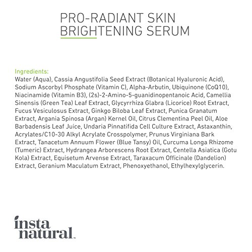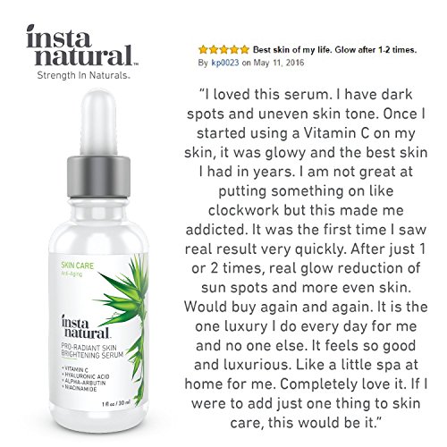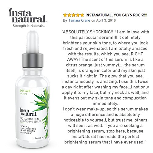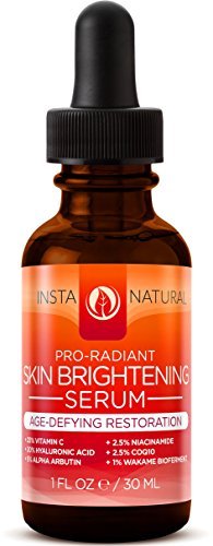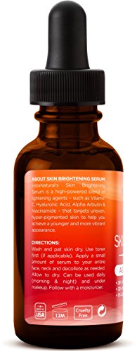 Studio : InstaNatural Publisher : InstaNatural Binding : Misc. Product Description InstaNatural's Skin Brightening Serum is a high-powered blend of lightening agents - such as Vitamin C, Hyaluronic Acid, Alpha Arbutin Niacinamide - that targets uneven, hyper-pigmented skin to help you achieve a younger and more vibrant appearance. InstaNatural's Skin Brightening Serum is produced in small batches to ensure quality and freshness....Made in the USA....MANUFACTURER GUARANTEE - InstaNatural backs their products with a Lifetime Money Back Guarantee, no matter where you buy our product. If you're not satisfied, simply contact us and get a full refund. 0
