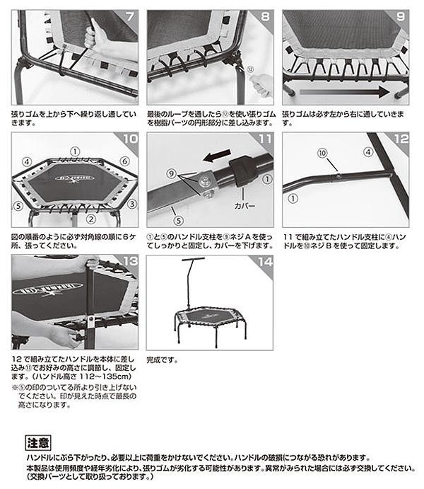 【注意事項】 ※本製品は一般家庭用です。不特定多数の方が使用するトレーニング施設などでは使用しないでください。 ※必ず耐荷重(約80kg)をお守りください。 ※ゴム式の為、使用劣化があります。 ※必ずマットなどを敷いてご使用ください。 ※組立は必ず大人2名以上で作業して下さい。 ※必ず使用前にパッケージ、取扱説明書に記載してあります注意事項、使用方法、組み立て方法をよく読み、正しくお使いください。 ※天災等の不可抗力や、お客様のお取扱いの不注意、不当な修理、改造による故障、破損等は保証しかねます。 ※本製品をエクササイズ(トレーニング)目的以外では使用しないでください。 ※本製品は一般家庭用です。不特定多数の方が使用する施設などでご使用にならないでください。 ※次のような方は、ご使用にならないでください。 ・妊娠中、生理中の方、体調不良、発熱時、過労時、ケガをしている方、飲酒、薬を使用されている方。 ・医師の診断で運動を止められている方。 ※身体に病気や障害のある方はエクササイズ(トレーニング)を始める前に必ず医師の診断を受けてください。 ・心臓病(狭心症、心筋梗塞など)、糖尿病、高血圧症(降圧剤を服用中の方など)、呼吸器疾患(ぜんそく、慢性気管支炎、肺気胸など)、変形性関節症、リウマチ、痛風、関節痛、その他、身体症状で不安のある方。 ※使用中、体調に異常を感じたときは、速やかに使用を中止して医師の診断を受けてください。 ※ご使用になる前に、必ず本製品の劣化や表面にキズや亀裂がないか確認してください。異常のある場合は危険ですので 絶対に使用しないでください。 ※直射日光が当たる場所、高温多湿な場所や屋外には放置、保管しないでください。商品の劣化、破損の原因となります。 ※トレーニングの効果は人や年齢によって異なります。急激に運動量を増やしますと体調を崩す恐れがありますので、徐々に体をならすようにして無理な運動をしないように心がけてください。 ※レンタル業・中古販売における他人への貸し出し・販売・譲渡によって発生した、損害・事故・各部品の損傷・劣化におきましては一切責任をおいかねますのであらかじめご了承ください。 ※より良い品質の向上に努めてまいりますので、予告なしに商品仕様、パッケージの変更がある場合がございますのであらかじめご了承ください。 ※画像のカラーはイメージです。撮影状況、ご使用のパソコンにより、色味が多少異なって見えます。予めご了承ください。 |