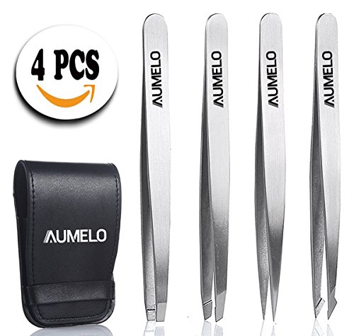 Tweezers Set 4-Piece Professional Stainless Steel Tweezers with Travel Case by Aumelo - Best Precision Eyebrow and Splinter Ingrown Hair Removal...