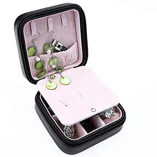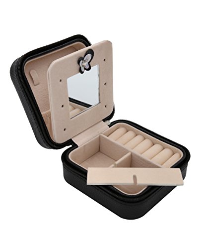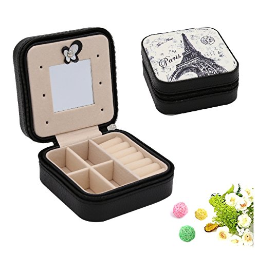 Wuligirl Black Travel Jewelry Box Case Organizer Eiffel Tower Ring Earrings Necklace Case with Makeup Mirror and Zipper Faux Leather (B Black Jewelry Box)
