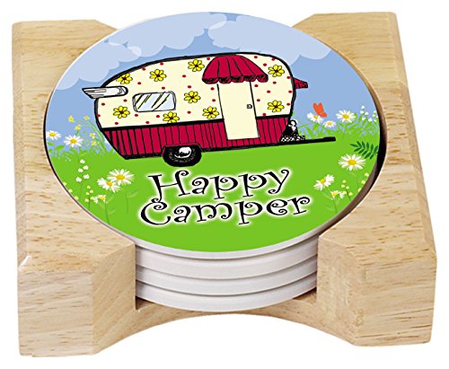 CounterArt Absorbent Coasters in Wooden Holder, Happy Camper, Set of 4