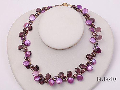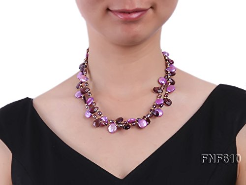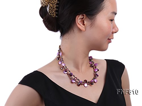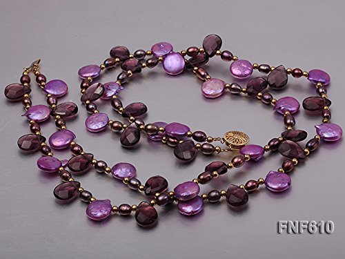 Description *This is a very lovely two-strand necklace set with 10x14mm purple side-drilled button pearls, 9x13mm purple flat side-drilled drop-shaped quartz beads, 4x5mm purple rice-shaped freshwater pearls and 3mm gilded beads.