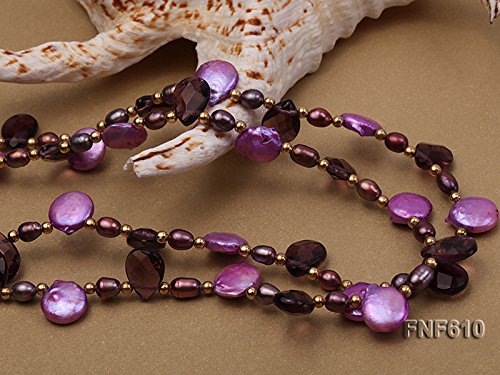 This is a very lovely two-strand necklace set with 10x14mm purple side-drilled button pearls, 9x13mm purple flat side-drilled drop-shaped quartz beads, 4x5mm purple rice-shaped freshwater pearls and 3mm gilded beads.