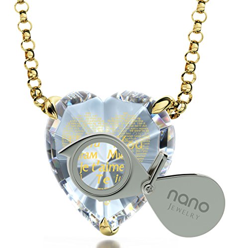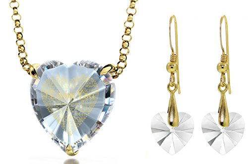 Gold plated I Love You necklace and Swarovski crystal heart drop earrings jewelry set. The Love necklace is inscribed in 24k gold with I love you in 120 languages, on to a heart-shaped cubic zirconia gemstone. The I Love You pendant, is beautifully inscribed using innovative technology, allowing us to write tiny text under the surface of the gemstone. The stylish cubic zirconia heart pendant measures 0.6 inches, 16mm and is prong set into a gold plated heart-shaped frame and beautifully rests below the lines of a gold filled rolo chain measuring 18 inches, 45cm. The incredible love necklace is paired with elegant swarovski heart crystal earrings measuring 0.4 inches, 10mm, while set in a gold plated pinch bail and measure 1.25 inches, 3.3cm in length, including the gold filled fish hooks. Available in a beautiful choice of colored stones, you're bound to find the perfect gift. Choose from the following alluring color choices; enticing purple, romantic red, classic black or timeless clear white crystal colored cubic zirconia pendant and heart Swarovski crystal stones. (Please note that only the necklace contains the 24k gold inscription). If you can't say it enough, say it in 120 languages! A romantic anniversary gift idea for any loved one; wives, girlfriends, best friends, mothers or a special treat just for you!Feature