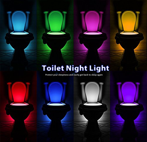 - COLORFUL AND FUN. Add some cheer to your nighttime bathroom visits with a selection of 12 different colors toilet night light, or automatic rotation through all the colors. 3 brightness levels too.