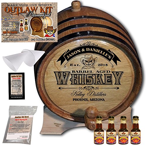 Studio : American Oak Barrel Publisher : American Oak Barrel Product Description Branded backside with Skeeter's face, insures this is a Certified, Authentic American Oak Barrel Product! Personalized Outlaw Kit "MADE BY" American Oak Aging Barrel - Design 103: Barrel Aged Whiskey - 2018 Barrel Aged Series............This vessel is handcrafted from American white oak, bound by 6 hoops of steel and features a stunning laser engraved design celebrating Dad's endeavors! Outlaw Kit includes Skeeter's Reserve Premium Essence necessary to create your own Spirit Masterpiece! The barrel is perfectly charred to release the sugar from the oak. After the firing process, the sugar caramelizes on the inner wall and is critical to mellowing the decanted spirit. The longer your spirits age in this barrel the smoother, refined or mature it becomes. Accommodates approx. 4 fifths of spirit. Please enjoy responibly! 0