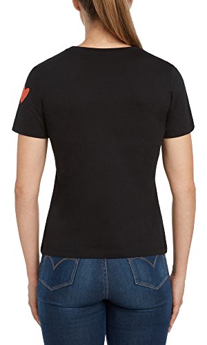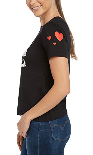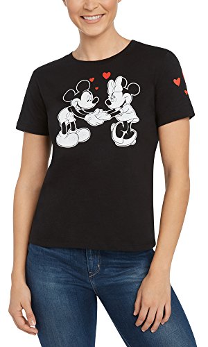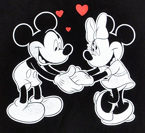 Women's Fitted t-shirt - runs smaller/slimmer than regular women's sizing. (Sizes Large and X-Large run especially small - you may want to buy a size larger.) Mickey and Minnie Mouse Valentine's Day print with red hearts on the left shoulder - officially licensed. Print is distressed (voids in the print where the black tee shows through) for a worn/vintage style (see photos). Lightweight/thin fabric is 100% cotton. Machine wash cold with like colors and tumble dry low. Model is 5' 10" tall, weighs 130 pounds and is wearing size Small.Feature
