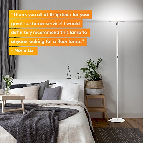 For one lamp capable of both mood and task lighting, Brightech's SKY 30 Flux Edition of the LED Torchiere Floor Lamp solves your lighting needs brightly and efficiently. Our Torchiere casts a warm white glow in any direction, providing enough light for a large bedroom or 20 x 15 living room.You can adjust SKY 30's brightness settings with a simple tap of a button. Power on, and the light comes up at color temperature of 3,000 Kelvin. Hit the power button again, and bask in a brighter 4,000K. Tap the button a third time and the color blazes at 5,000K! Within each of these settings, you can hold down on the power button, and watch the light cycle up and down through a brightness gradient. When you reach the desired ambiance, let go of the power button and SKY 30 Flux will stay at that light level. Please note, this lamp is NOT compatible with wall switches, and if a wall switch is used, there will be up to a 5 second delay.The long-lasting LED lights don't give off heat like halogen or incandescent lighting. Equivalent to 120 incandescent watts, our built-in 30-watt power-saving LED fixture stays cool even after hours of use. Omni-directional head lets you pivot the light anywhere: over tasks on your worktable, or away into a corner.Easy to assemble, and easier to love, the simplicity of the lamp's minimalist design lets you have it upright and running within minutes. Choose from black, white, silver, dark bronze, or a metal finish in satin nickel. The slenderness of the SKY lamp lets you position it in even the tightest corners. Height is 67 inches. The surface of the ¾-inch diameter light fixture measures nearly 10 inches across. Lamp cord extends just over 7 ½ feet. The sturdy, felt-covered weighted base (13 pounds) means that children and pets can't tip it over. In addition, the LED light never has to be replaced because it is integrated into the fixture and expected to last over 20 years.Feature