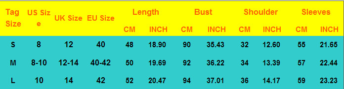 Length 49 Shoulder 37 Sleeve 60 Sleeve Width 21.8 Waist 92 Bust 96-100 Bottom Width 66CM