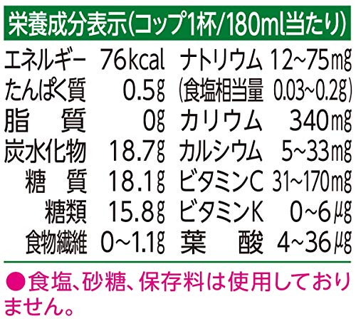 原材料:野菜(にんじん、ケール、ほうれん草、アスパラガス、クレソン、パセリ、かぼちゃ、レタス、キャベツ、ビート、だいこん、はくさい、たまねぎ、セロリ)、果実(りんご、うんしゅうみかん、オレンジ、レモン)/クエン酸、香料、ビタミンC