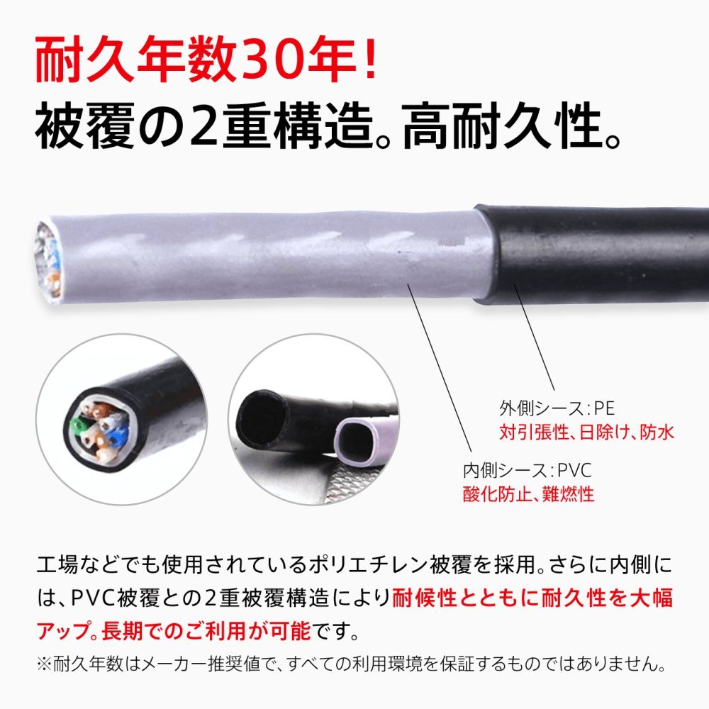 LAN cable for outdoor wiring is designed to improve weather resistance by double coating structure so that it can be used for outdoor use of general purpose lan cable.