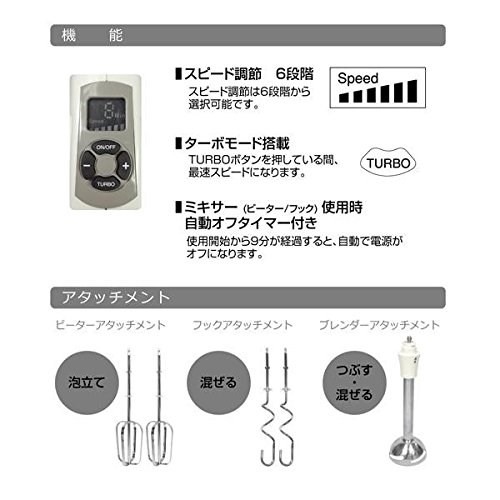 Speed adjustment 6 stages and turbo function are also equipped, beater · hook · blender and high spec item included with abundant attachment