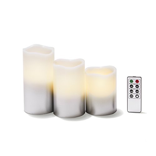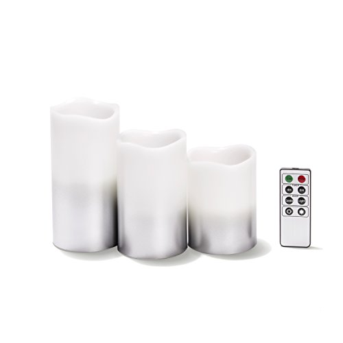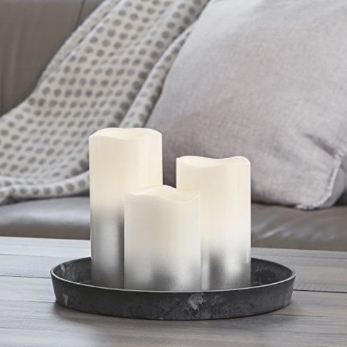3 Flameless Pillar Candles, Neutral White LEDs, Silver/White Faded Finish, Remote & Batteries Included