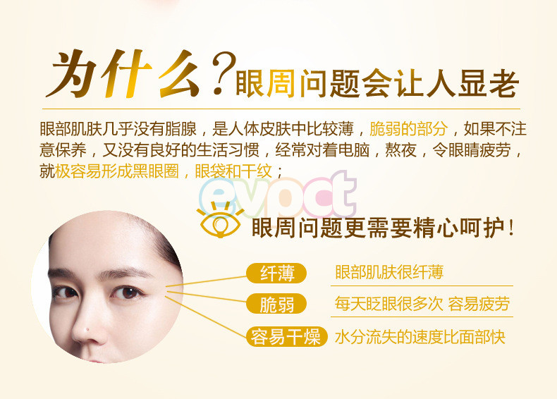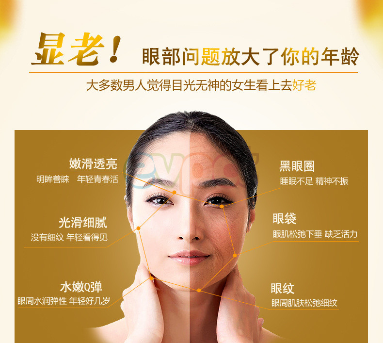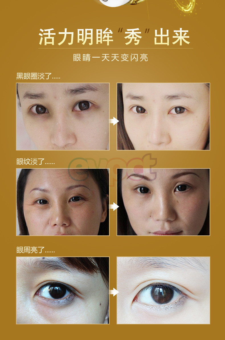 Deeply nourish the eyes skin, increase the elastic of eyes skin and promote the metabolism of skin cells, get rid of the eyes edema quickly and fade dark circle, eyes bags and wrinkles.u0026nbsp;