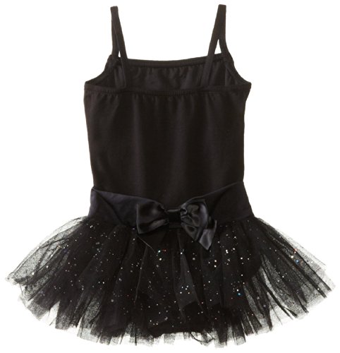 Super fun glitter tulle tutu on our nylon camisole dress. Perfect for any studio and every recital. Fully lined front bodice. Detailed skirt waistband with faux ribbon belt and bow. Great for dress up.