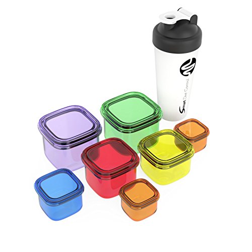 SDC - 7 Piece Portion Control Containers & Protein Shaker Bottle Kit with COMPLETE GUIDE + 21 DAY MEAL PLANNER + BONUS EBOOK, Leak Proof Microwave and Dishwasher Safe