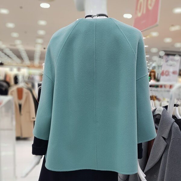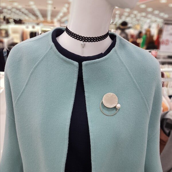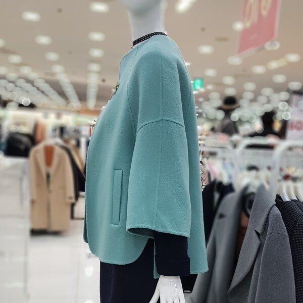 모100%에 가볍고 포근한 아이네요어깨선없이 ?~떨어지는 핏에A라인 소매는 상체통통 제가 날씬해보이구요 엉덩이 살짝 덮히는 기장에 넘 좋으네요라운드넥에 센스있는 브로치가 여성스럽네요