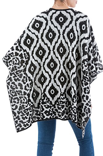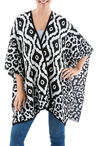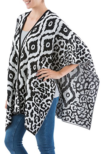About this item: This dramatic design combines concentric rhomboids in white and black. By Waldo Berrios, this traditional Andean ruana cloak is open at the sides and front. The artisan works in a warm blend of alpaca to knit the reversible wrap, and adds abstract motifs that flow around the hem. 29.5" L x 42.0" W - Dry clean or hand wash in cold water