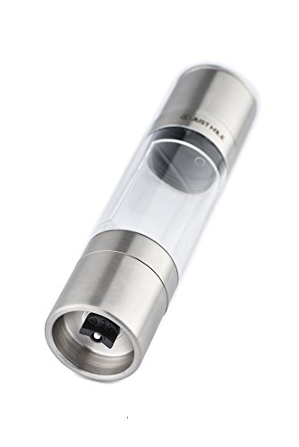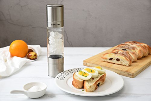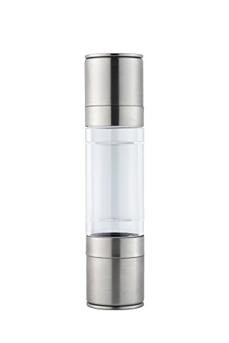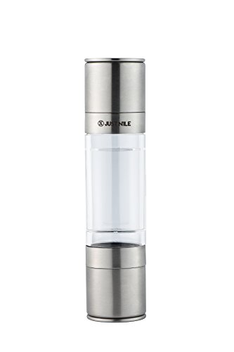 Studio : JustNile Publisher : JustNile Product Description Turn your routine meals into a contemporary dining affair with this 2-in-1 salt pepper manual grinder mill. Its convenient single piece design helps minimize clutter, and makes it easy to grab and transfer between the kitchen dining table. Our intuitive design incorporates a clear glass body allowing you to easily see its content levels and anticipate your next refill. The body holds up to 100g of salt or 50g of peppercorns (1.2 oz volume each compartment). The transparent body also shows the colors of coriander or cumin seeds, paprika, chilli flakes many more seasonings beautifully on your kitchen countertop. What's more, the adjustable knob at the base of the mill at each end can be turned to adjust for the coarseness or fineness that you prefer for your seasonings. From the kitchen to the dining table, this sleek chrome salt pepper mill is sure to elevate mundane meals to a trendy, dining experience. 0
