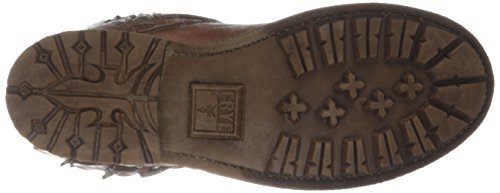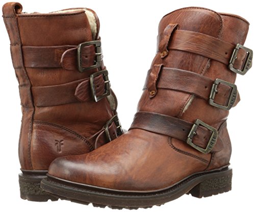Wrinkled leather Frye moto booties feel luxurious with full shearling lining. A sturdy lug sole complements the rugged look, and an inset crepe panel cushions the chunky heel. Exposed side zip and 3-buckle closure.Feature