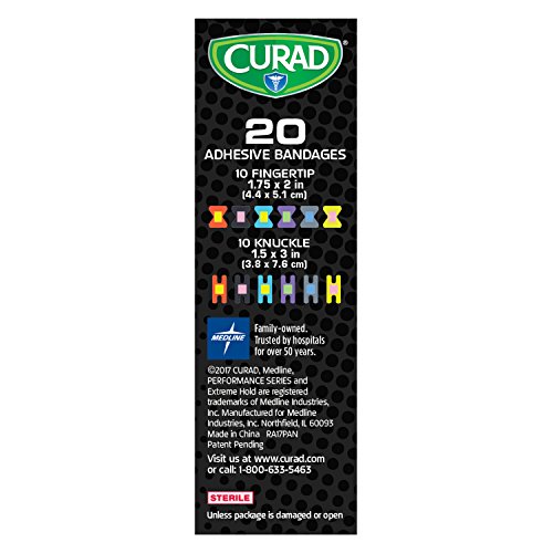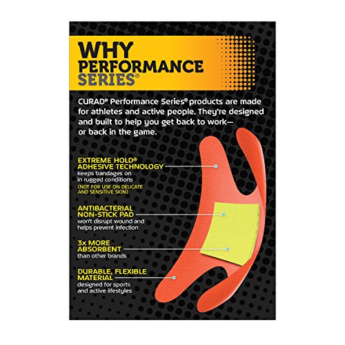 At the game, the gym or on the trail, Curad Performance Series Bandages won't quit. These bandages feature extreme hold adhesive technology. Tough, heavy duty fabric offers outstanding protection that is also breathable and flexible. The antibacterial wound pad material is three times more absorbent than most other leading brands and helps prevent infection. Not for use on delicate and sensitive skin.Feature