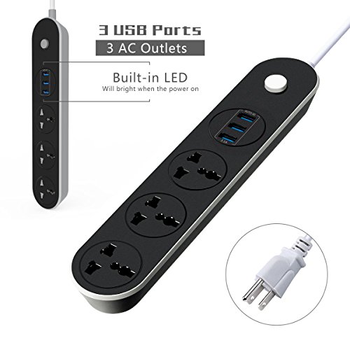 Power Strip Surge Protector, Hizek 2500 Joule 3-Outlet Power Strip with 3 USB Charging Ports 1.6M/5ft Cable (Black)