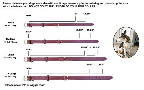 Small: 9.0"-11.50" | Width: 0.60" | Total Length: 16" Medium: 11.75"-15.25" | Width: 1.00" | Total Length: 20" Large: 15.50"-19.25" | Width: 1.25" | Total Length: 24" X-Large: 20.50"-25.00" | Width: 1.25" | Total Length: 31" IMPORTANT: Please measure your dogs neck with a soft tape measure before ordering. Check out our matching leather leash - sold separately. Viosi is Family owned and operated in Los Angeles with 100% control over quality and service. We have a no questions asked 100% replacement guarantee. 0 |