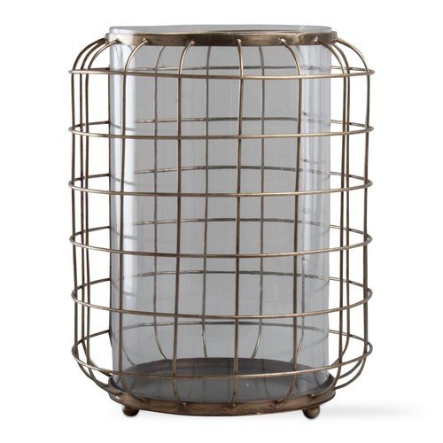 Studio : tag Publisher : tag Binding : Kitchen Product Description Shine a light with this brass wire rustic hurricane candle holder. It is made from wire in an elegant brass finish for a country-inspired look. It holds up to a 4 inch diameter pillar candle (not included). 0