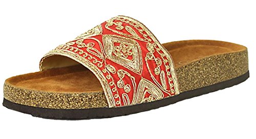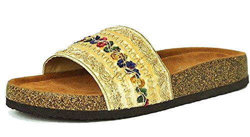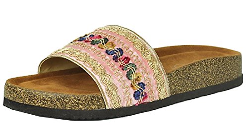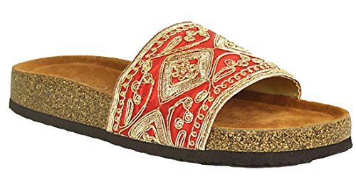 Product DescriptionRefresh Footwear Women's embroidered slip-on sandal features multi-color threading throughout with 2" cork sole. Imported.0
