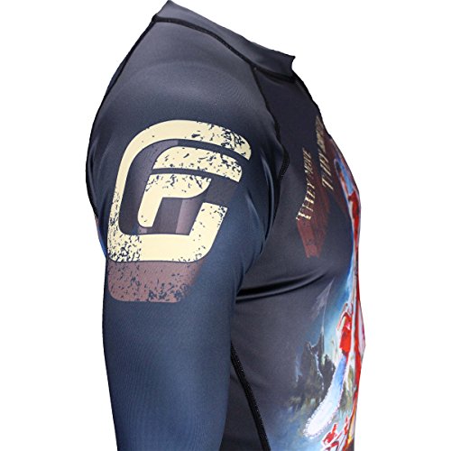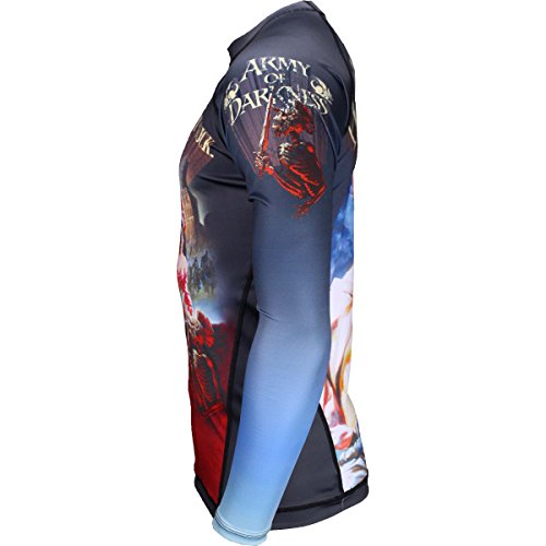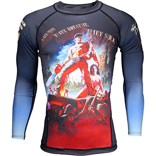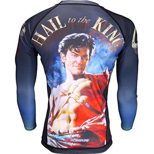 -. Brand : Fusion Fight Gear -. Color : Blue-Red -. Department : mens -. Feature : The classic 1992 poster featuring the Chin fiercely battling off the undead with his signature chainsaw attached to his hand is printed on the front of this BJJ rashguard / The back of this rashguard has a zoomed in picture of Ash's face / Fusion Fight Gear logo printed on the right sleeve and the Army of Darkness logo printed on the left sleeve / Made of high-end 88% polyester and 12% spandex blend / This higher spandex content creates more elasticity and results in a more comfortable, contoured fit that hugs your body and makes you tough to grab -. Label : Fusion Fight Gear -. Manufacturer : Fusion Fight Gear -. MPN : VT001 -. PackageQuantity : 1 -. PartNumber : VT001 -. ProductGroup : Sports -. ProductTypeName : OUTDOOR_RECREATION_PRODUCT -. Publisher : Fusion Fight Gear -. Studio : Fusion Fight Gear -. Title : Army of Darkness Hail to the King Rashguard