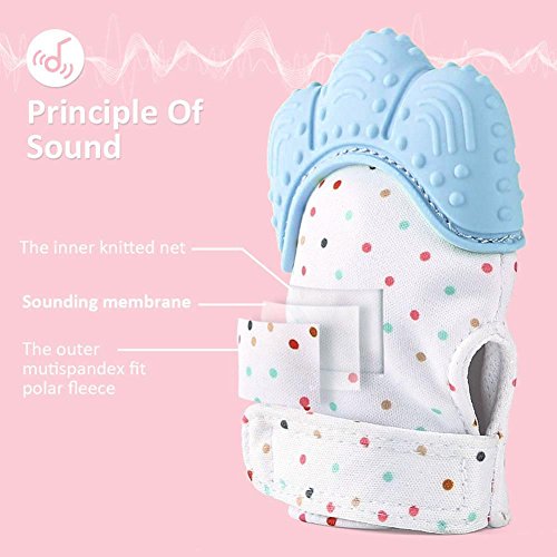 Binding : Apparel Product Description This teething gloves keep teething baby safe from scratching themselves, saliva irritating their skin, and lessen the chance of developing blisters from thumb sucking.And the top soft silicone teether helps your baby relieve sore gums too. When the baby wears and bite's the mitten would make a slight noise like a candy wrapping paper being opened. The stimulating crinkle sound would be more attractive to babies.So your baby will entertains self by our teething mitten. The top soft silicone teether helps your baby relieve sore gums. The crinkle sound, pain relieving texture, and teething mitt crinkle sound will stimulate learning to help your baby reach their developmental milestones sooner. This BPA FREE teether have FDA CE certification.The BPA FREE material keeps your baby from all harmful bacterial and easy to clean and dry.You can just put it into washer and dryer The teething mitten comes with an adjustable Velcro strap to prevent baby from dropping it on the ground and soft breathable fabric that absorbs drool so you spend less money and time doing laundry. The mitts are machine washable, super easy to clean. 0