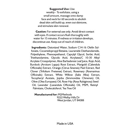 Watch fine lines and even discoloration disappear with our anti-aging glycolic scrub. Plant extracts and oils moisturize while helping to reduce scarring. Multi-fruit acids and salicylic Acid work together to prevent breakouts and to stimulate skin renewal.