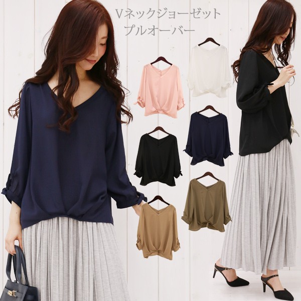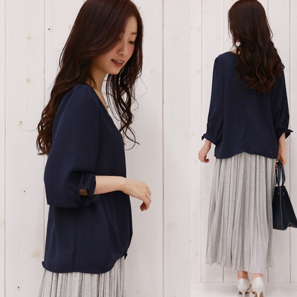 広めに開いたVネックでデコルテラインをきれいに見せるブラウス。 手持ちのボトムに合わせるだけで大人の洗練されたスタイルが楽しめます。