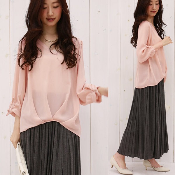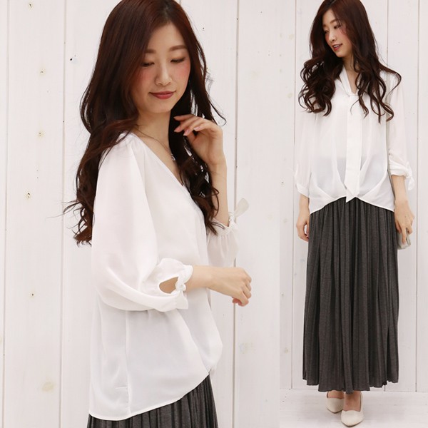 袖に深いスリットが入っており、 先端をリボン結びにしてお洒落にキメるのがポイントのブラウスです。