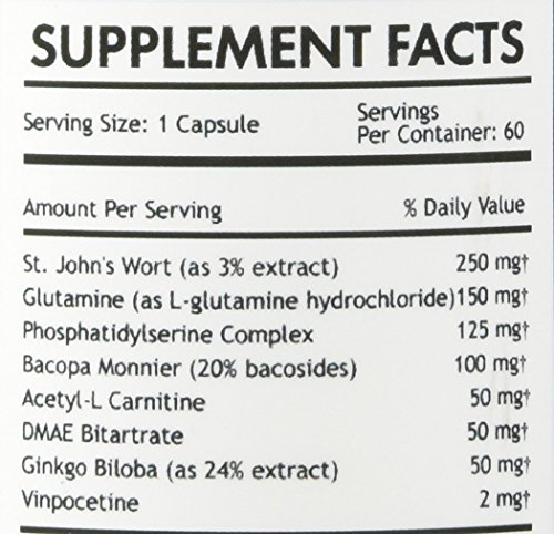 St. Johns Wort, Glutamine, Phosphatidylserine Complex, Bacopa Monnier, N-Acetyl L-Carnitine HCI, DMAE Bitartrate, Gingko Biloba, Vinpocetine, Huperzine-A, Vegetable Cellulose, Rice Flour, Vegetable Magnesium Stearate, and Silicon Dioxide