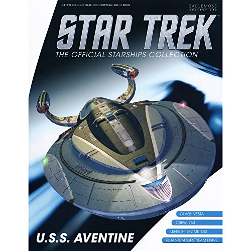 This ship has been painstakingly recreated in die-cast and plastic materials then hand painted with an incredible level of detail. The vehicle also comes with a full color collector magazine. Vehicle measures approximately 5-1/2 inches long x 1-1/2 inches wide x 2-1/2 inches tall (mounted on base). The USS Aventine (NCC-82602) is a Vesta-class Federation starship in Starfleet service in the late 24th century. As of the year 2381, Aventine was under the command of Captain Ezri Dax, with a crew of about 750. (Star Trek - Destiny novel: Gods of Night) The Aventine saw her first combat action against the Borg during the invasion of Acamar. During the battle, the commanding officer and the executive officer were both killed, leaving Ezri Dax in command of the ship. One week after the battle, Starfleet officially promoted Dax to captain and gave her command of the Aventine. The fully illustrated magazine features product artwork and highlights the ship's history and design. 0 |